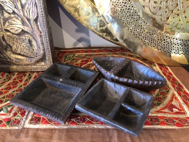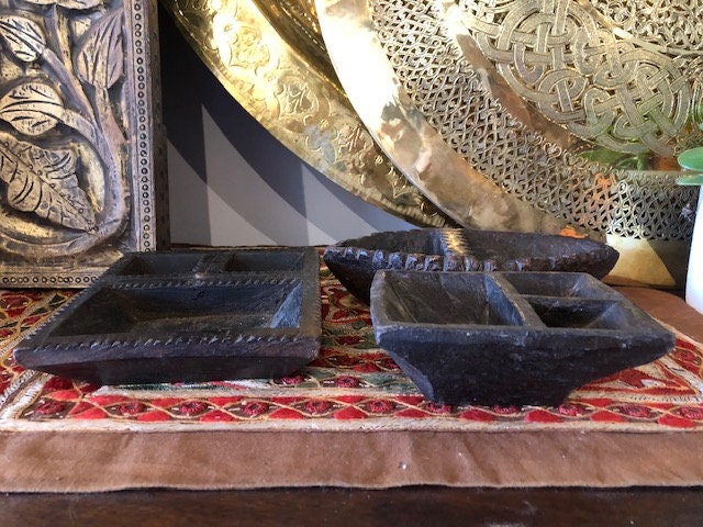 Set of 3 Hand carved Small Wooden Indian Spice holder, Beautiful one-of-a-kind vintage salt and pepper holder from the 1960s have been handcrafted from a single piece of solid wood, In Good condition Each piece is different, Keep jewelry and other small items.