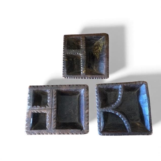 Sat of 3 Hand carved Small Wooden Indian Spice holder, Beautiful one-of-a-kind vintage salt and pepper holder from the 1960s have been handcrafted from a single piece of solid wood, In Good condition Each piece is different, Keep jewelry and other small items.