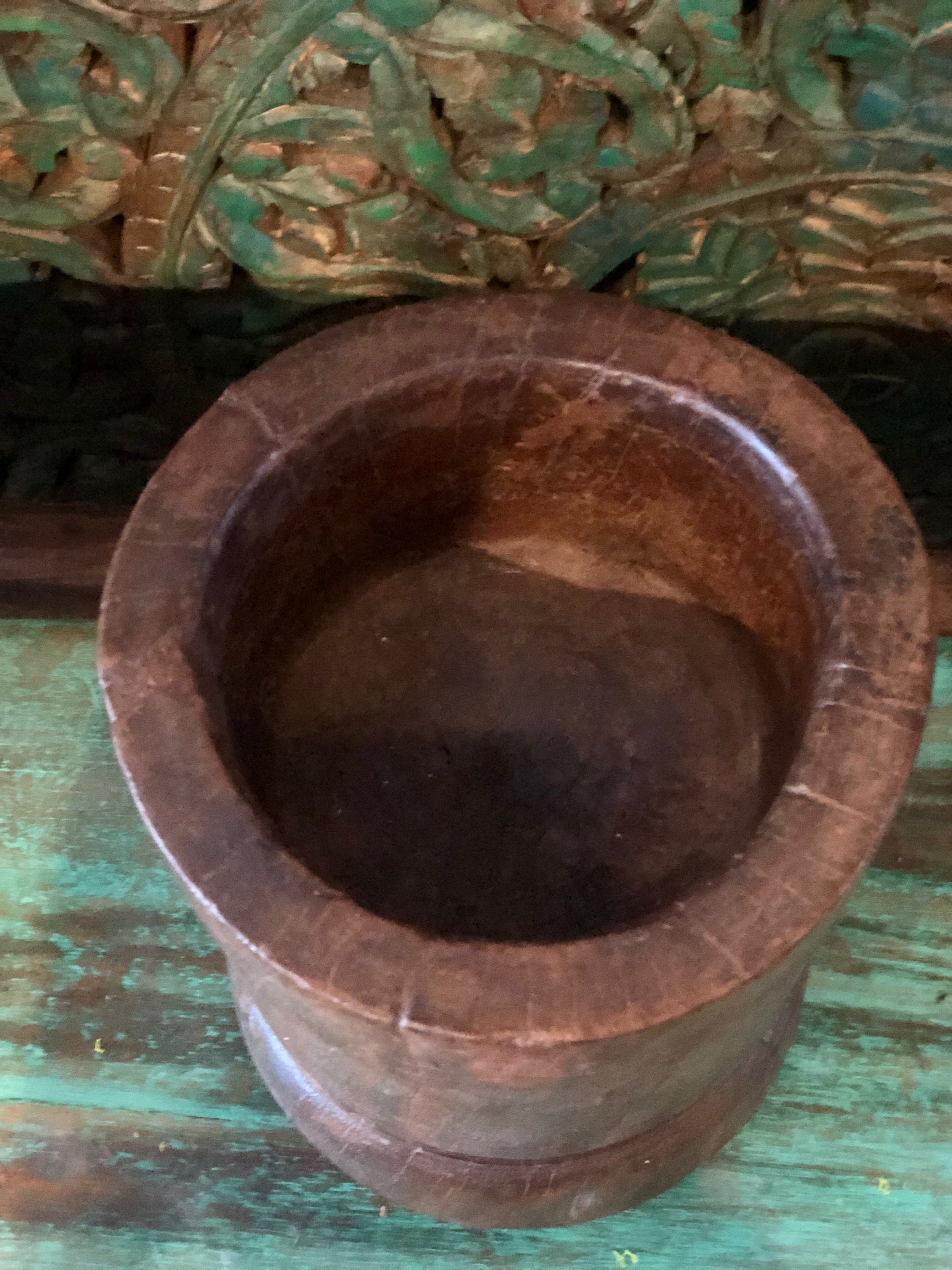 Old Carved wooden planter, Indian wooden ukhali, wooden pot, Indian mortar