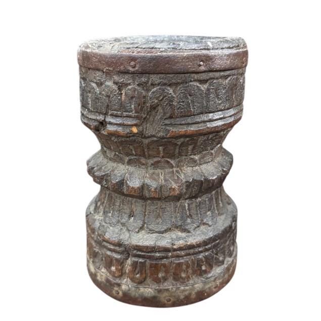 Vintage Hand-Carved Wooden Planter: Rustic Indian Ukhali Pot